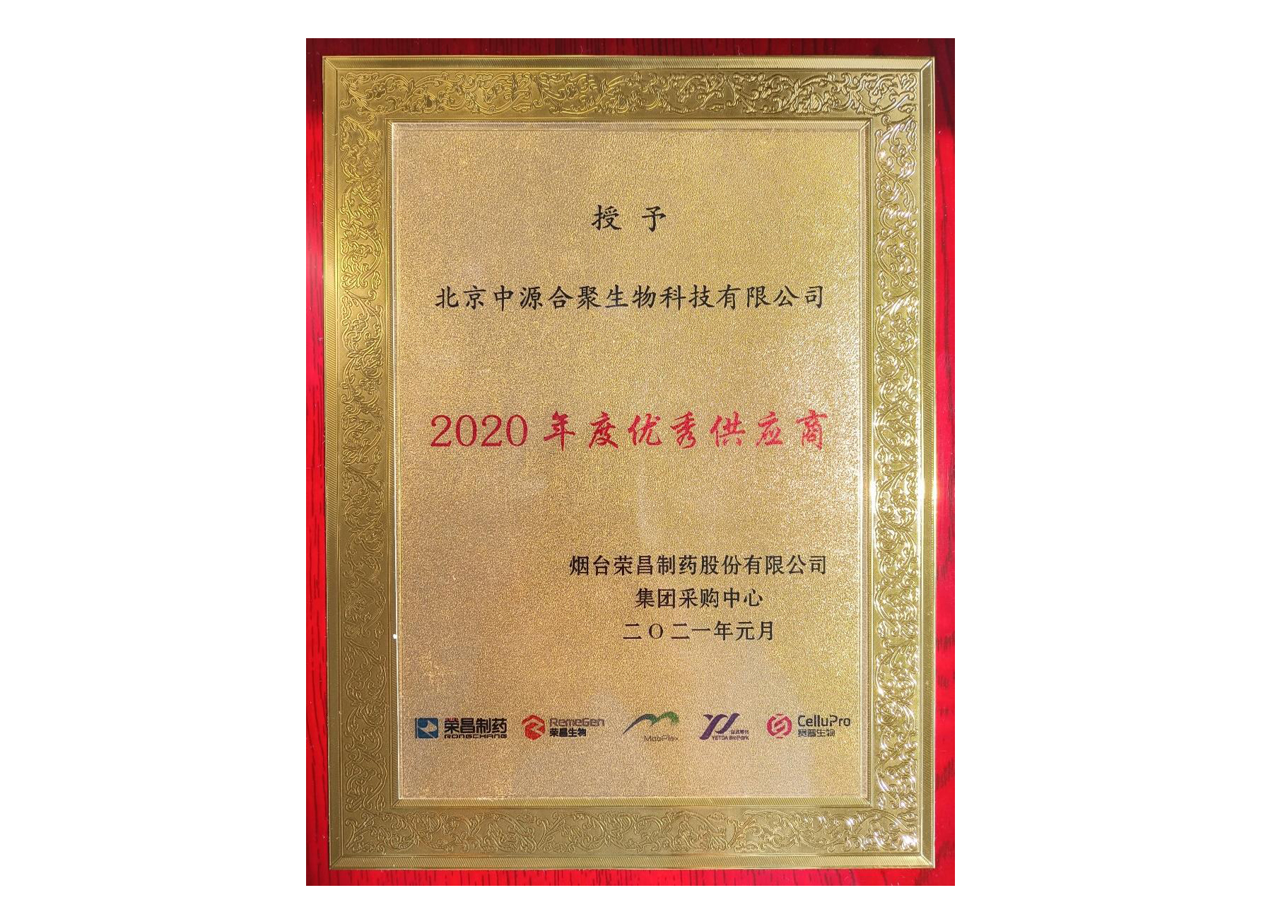 荣昌制药“2020 年度优秀供应商”称号