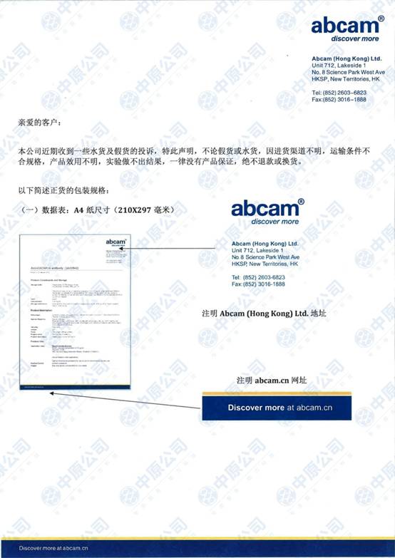 近期,Abcam公司收到一些水货及假货的投诉,这种产品,因进货渠道不明,运输条件不合规格,产品效用不明,从而导致一些实验做不出结果。在此,Abcam特此声明,这类产品一律没有产品保证,不退款或换货,请从正规渠道订购。12-02-10