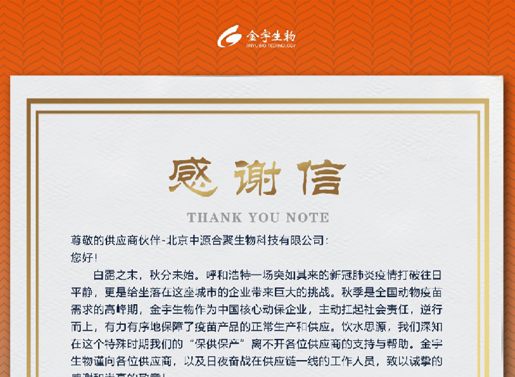 近日,金宇生物技术股份有限公司(以下简称“金宇生物”)发来感谢信,对我司在呼和浩特疫情突发期间为疫苗产品“保供保产”做出的贡献表示衷心的感谢。22-12-08
