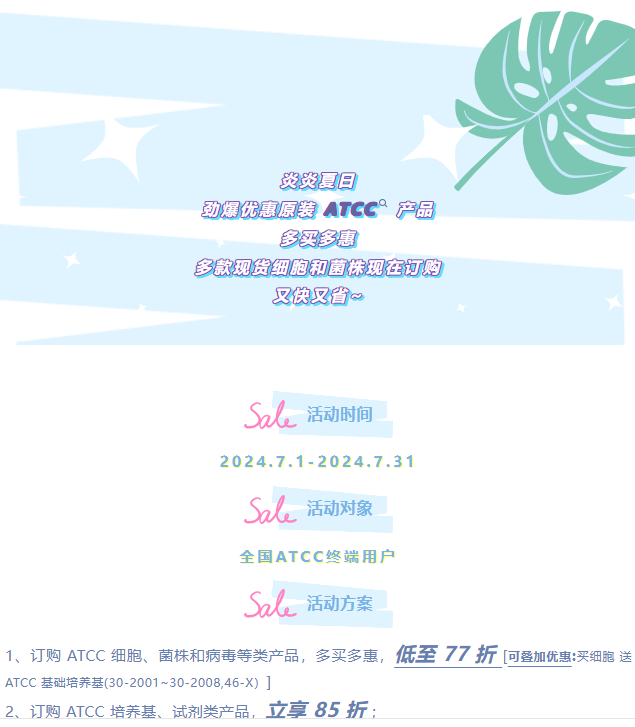 炎炎夏日 劲爆优惠原装 ATCC 产品 多买多惠 多款现货细胞和菌株现在订购 又快又省~24-06-28
