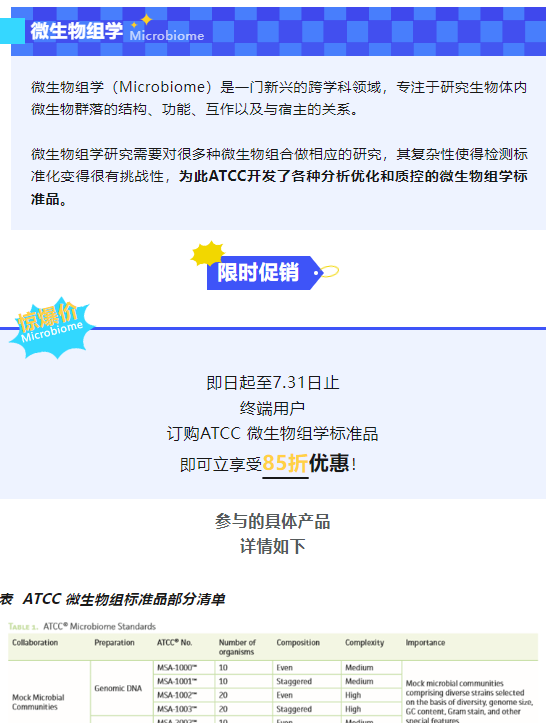 即日起至7.31日止 终端用户 订购ATCC 微生物组学标准品 即可立享受85折优惠!24-06-14