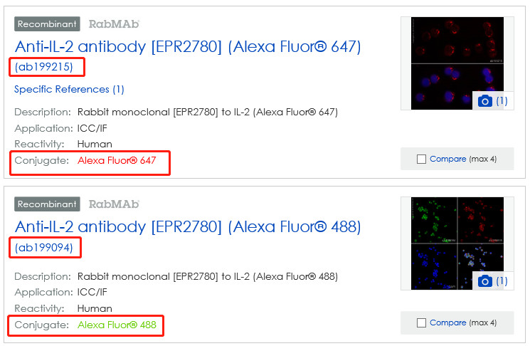 关于第2点,我们举例进行说明。如下图所示,同一克隆号【EPR2780】的IL-2抗体偶联了不同的荧光素(AF647和AF488),其抗体货号不同,是2个不同的产品。